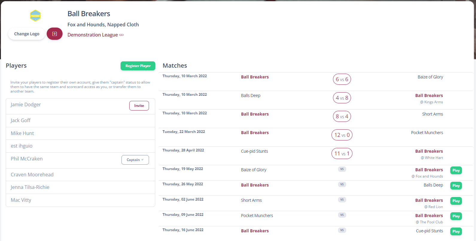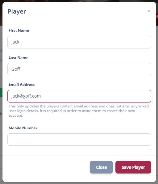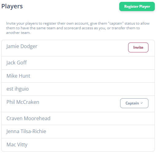 If a player has an email address registered in the system, they can be invited to the platform. In this example we can see Jamie Dodger has an email address, and an Invite button is present.
