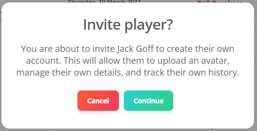 And if you press Continue, the invite will be sent. The Captain can then ask the player to check their email. If they don't receive it, please ensure they check their spam/junk mail and allow emails from "@rackemapp.com". You'll see that the inviste is sent as the button will now say Resend Invite.